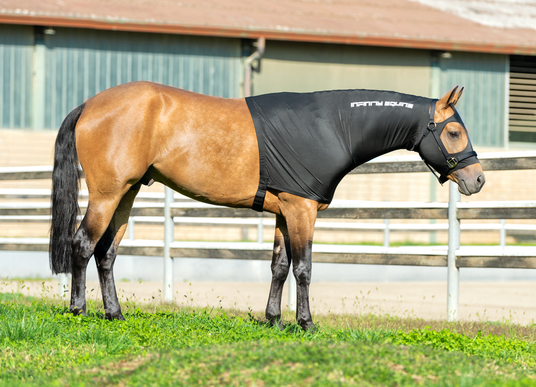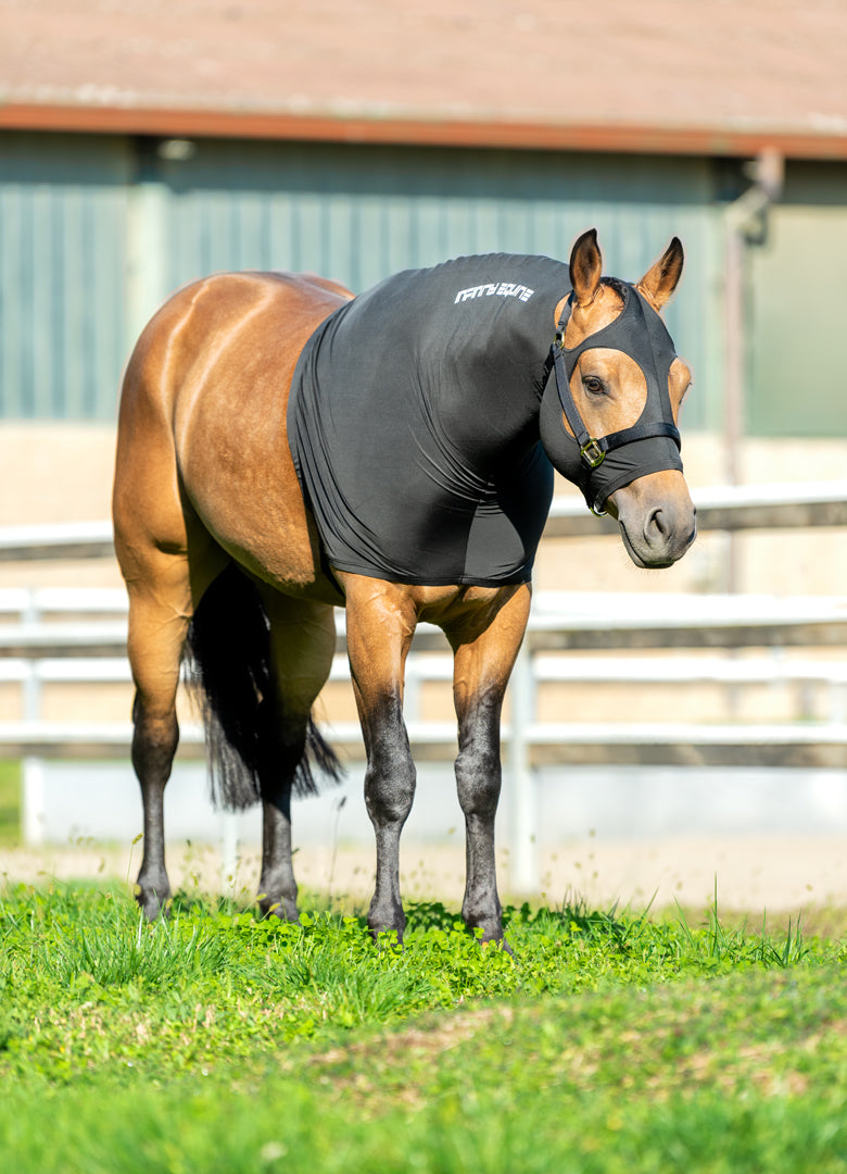 Cappuccio in lycra di ottima qualità molto resistente. Full zip, i fori per gli occhi e le orecchie sono stati studiati sulle dimensioni dei quarter in modo che il cappuccio non entri in contatto con le zone delicate del cavallo.